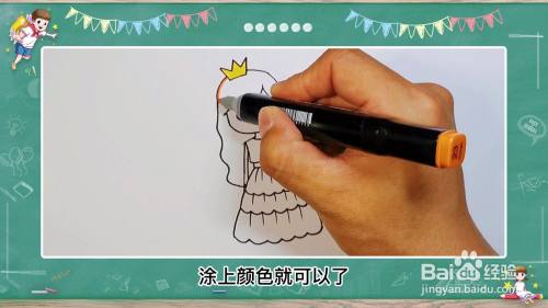之后画出大大的裙摆,裙摆上画出人字形的荷叶状,补充上胳膊和大波浪的头发,把公主涂上颜色就可以了,荷叶裙公主就画好了。