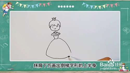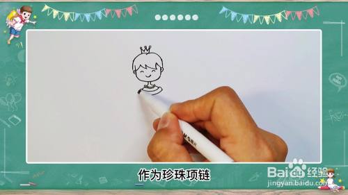 先画出公主的头发,以锯齿形碎头发为头帘,之后画出脸的轮廓,填充上鼻子,眼睛和嘴巴,头顶画上皇冠,之后画上细细的脖子,脖子下方画一串相连的圆圈作为珍珠项链。