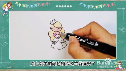 然后画打开的八字形状作为裙摆,裙摆下方画出像U字形相连的裙尾,在头顶向下的地方画出大波浪的头发就可以了,涂上公主的颜色,婚纱公主就画好了。