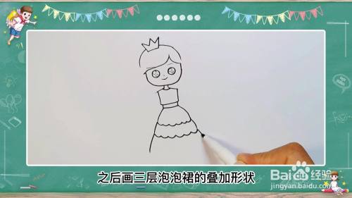 然后画出细长的脖子,脖子下画一正方形为上身,下面再加一条长方形为腰,之后画三层泡泡裙的叠加形状。