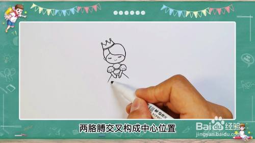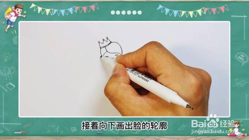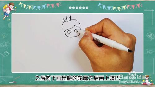 首先画一个皇冠,皇冠两侧画出弧形为头顶,头顶下方右边三分之一处画出人字形为头帘,之后向下画出脸的轮廓,之后画上嘴巴,眼睛,鼻子。