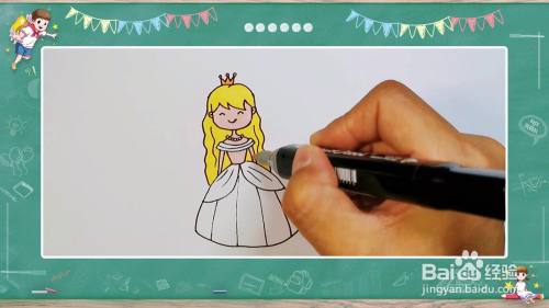 最后画上胳膊,头发向下画出大的波浪,涂上颜色就可以了,泡泡裙公主就画好了。