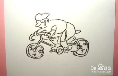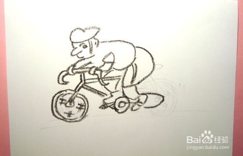 然后,用黑色蜡笔画出男孩的裤子和腿脚的部分,并画出自行车的前面的轮胎的图形,如下图所示。