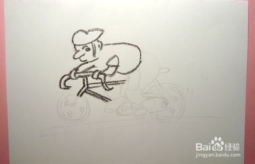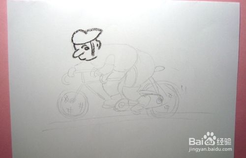 用铅笔在白纸上绘制一个草图,接着取黑色蜡笔画出骑自行车的男孩的帽子和脸型的部分,并画出男孩的眼睛、鼻子和嘴巴的图形,如下图所示。