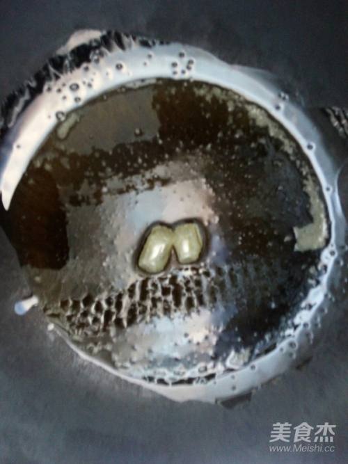 5锅里倒入少许菜籽油,加入两颗冰糖,炒至冰糖熔化冒泡