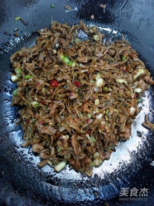 7将准备好的花椒、葱、姜蒜、泡椒,倒入刚煎肉皮的油锅里,炒香后放入切好的芽菜继续炒,炒后的芽菜会更香