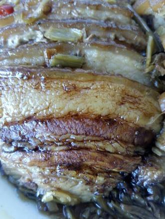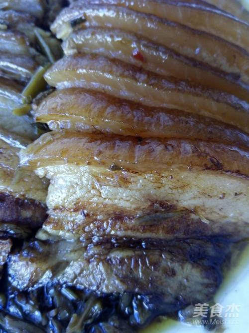 9将炒过的芽菜放在码好的肉上,最后沿碗边淋上之前腌肉的酱汁,上锅大火蒸40分钟左右即可。