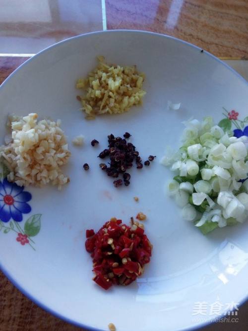 4准备花椒(怕影响口感的可以用花椒面),大葱、泡椒切碎,姜蒜切末,备用