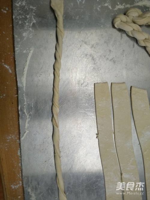 5切成等份的条状 用手取一个小长面挤揉搓拉长。两边对上拧成一次麻花型。