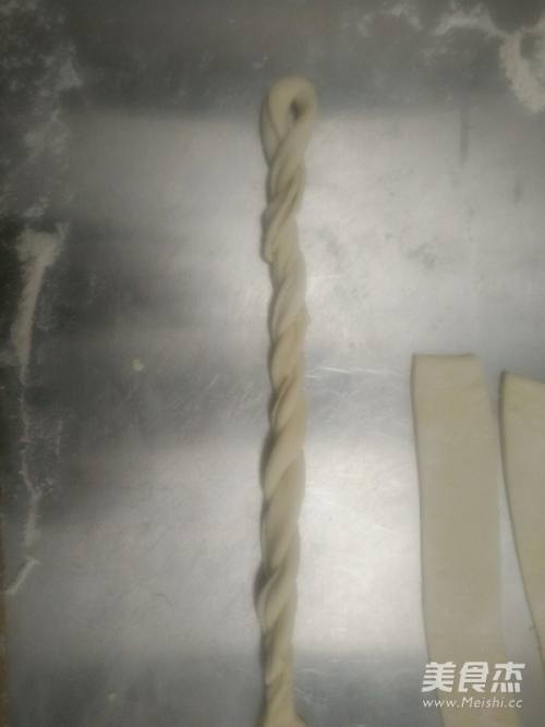 6用手取一个小长面挤揉搓拉长。两边对上拧成一次麻花型。