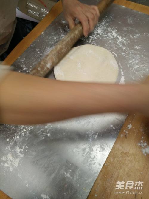 4把和好的面平铺在案板上面。用擀面杖擀平。