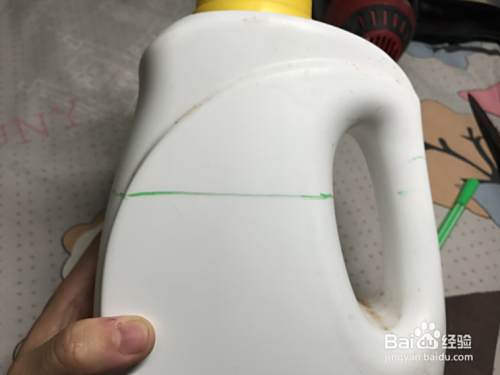 去除标签后,我们拿出水彩笔,围着洗衣液的瓶身画一圈线,画线的目的是让我们在剪瓶子的时候作为参考线。