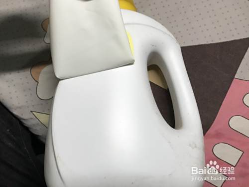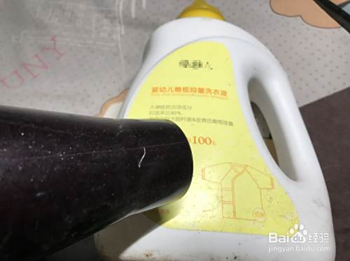我们取出自己用完的洗衣液瓶子,使用家里的吹风机对准洗衣液瓶子的标签,开启热风模式吹。