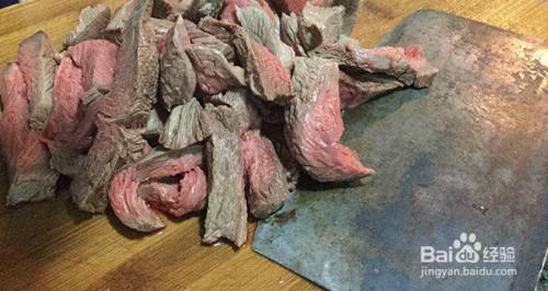 第二步:切牛肉 取出牛肉用水冲洗干净并切条,牛肉条大概小手指粗较好,太粗的话不容易入味。因为牛肉通常较厚,除血水不容易把牛肉全部煮熟,因此中间还有点红但并没有什么影响。牛肉切好以后留下备用。