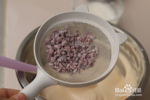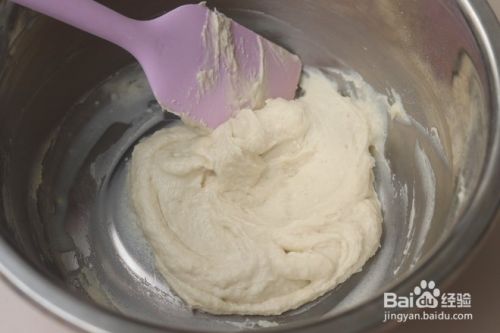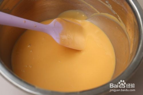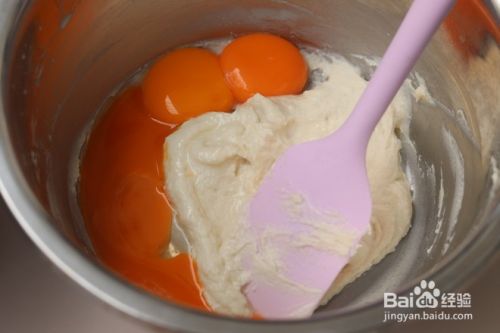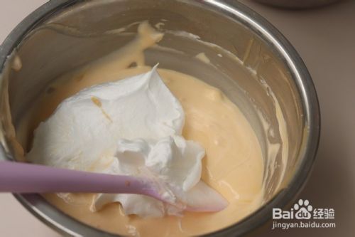 打发好的蛋白分3次加入蛋黄糊中,拌匀。
