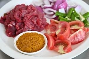 将牛肉切薄片、洋葱切片、辣椒切片、西红柿去皮切片。