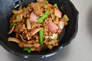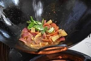 热锅冷油放入洋葱、西红柿翻炒加入咖喱粉,翻炒后加入青椒,加入盐、鸡精。