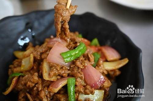 将滑好油的牛肉倒入锅中一起翻炒加入水淀粉勾芡,淋上香油即成。