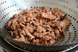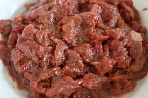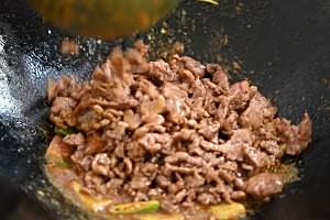 锅上火,热锅冷油,等油温升到80℃以上的油温,将腌制好的牛肉倒入锅中滑油。然后将滑好油的牛肉盛出。