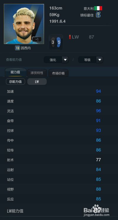 因西内(锦标赛季):因西内现在是意大利国家队的常客,他在那不勒斯也是球队的进攻核心,不管助攻还是射门对他来说都很简单,游戏中的因西内各项数值都很不错,但是射术仅仅77,不过用起来我赶紧远超77。
