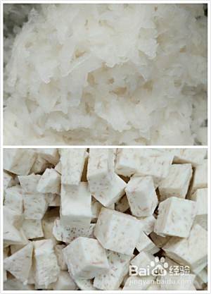 芋头切粒,萝卜刨丝;