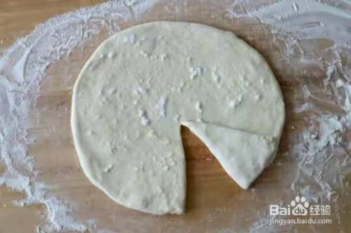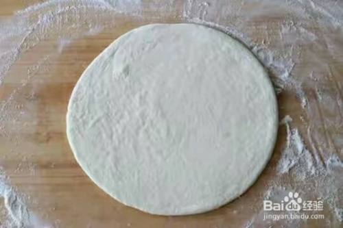 用擀面杖擀成规则的圆形饼坯,如果有沾手现象随时在面皮上撒面粉。