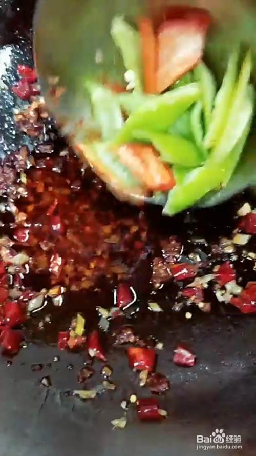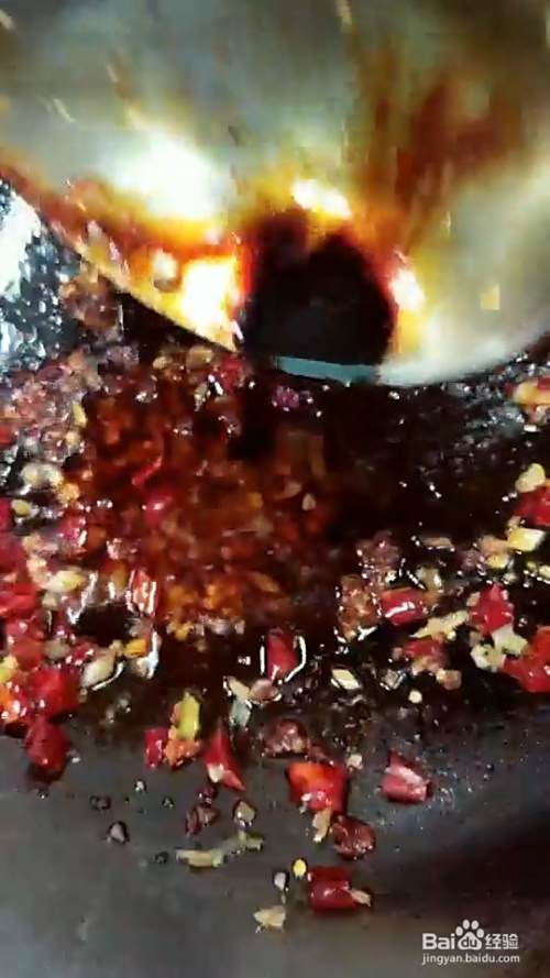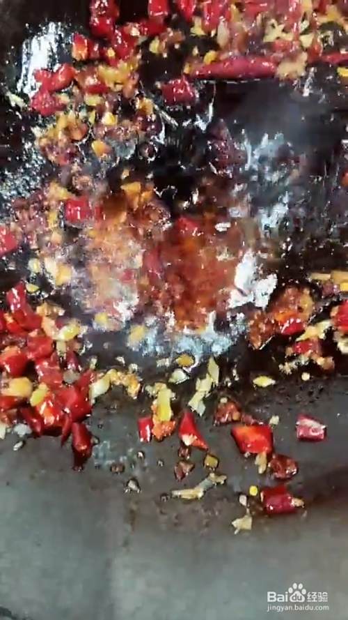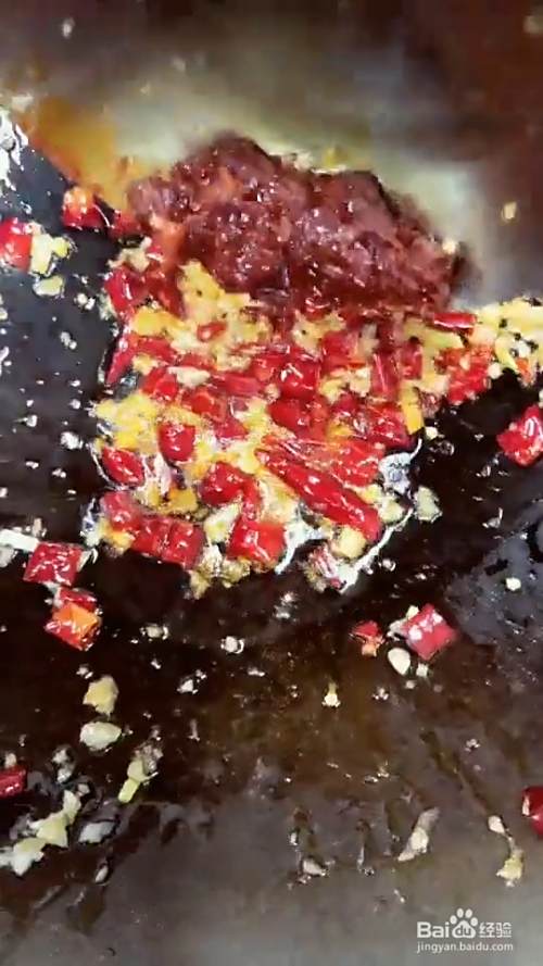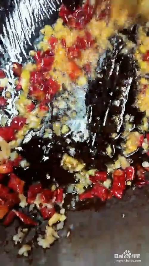 在锅内放少许植物油,油热后将切好的葱、姜、蒜末和辣椒末放入锅内,炒出香味。