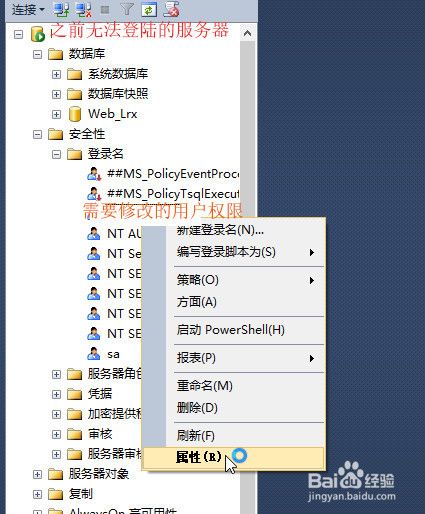 依次展开:安全性>登录名。找到需要做更改的用户名,打开属性。