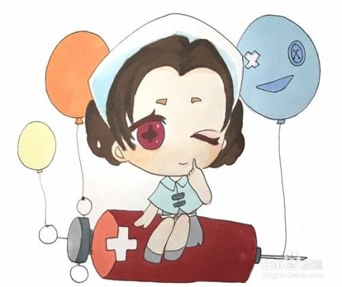 首先画出医生的头发和帽子,接着画出脸型之后再画上眉毛、眼睛和嘴巴,然后下面画出医生的身体,底下再画上一个针筒和几个气球。然后给医生的头发涂棕色、脸部涂肤色,然后衣服、针筒等都涂上颜色,可爱的医生就画好啦。