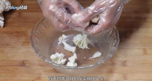 1首先将准备好的花菜摘成小朵,用清水洗净。