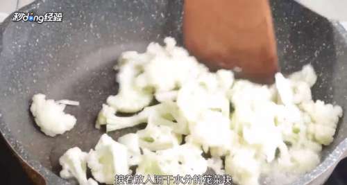 3起锅烧油,油热后放入蒜末爆香,放入沥干水分的花菜大火翻炒,炒至花菜熟。