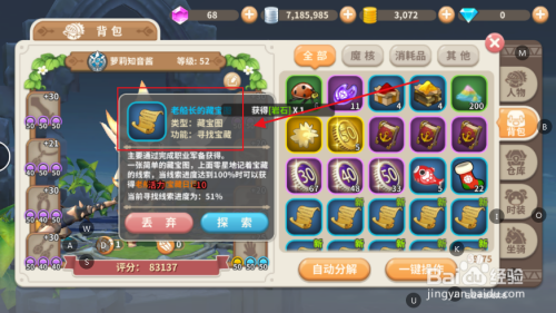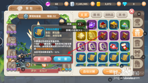 获得足够的任务道具。玩家就可以去参加任务了。参加任务有两种方式。第一种就是直接点击背包中的任务道具。然后继续点击任务道具详情页中的探索。