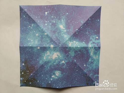 将正方形彩纸折出“米”字折痕,并聚合成双正方形。