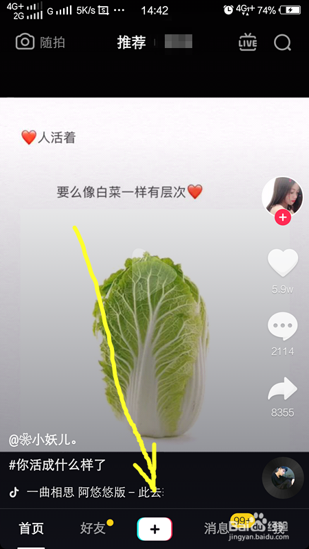 我们进入抖音短视频界面以后,我们可以看到正在播放短视频,之后我们看懂啊下方有一个加号,我们点击下方的加号,进入拍摄的界面。
