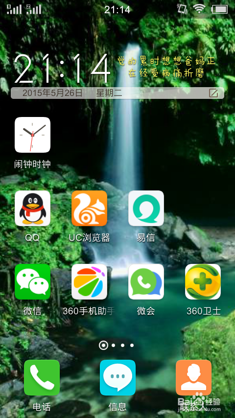 进入手机界面,包括你在使用手机应用程序期间。我用VIVO手机举例,按住电源键后立刻按下HOME键(主屏幕),房子形状的触摸按钮。就可以截屏。截屏后会看到图片里有手心网络信号,时间显示,电量显示等,这也就是很多人在微信朋友圈里经常发布的那种图片。比如聊天记录等。