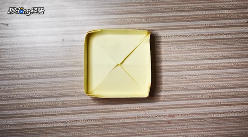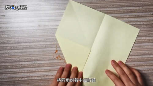 一张正方形彩纸,首先将纸对半折,将四角对着中点折叠。