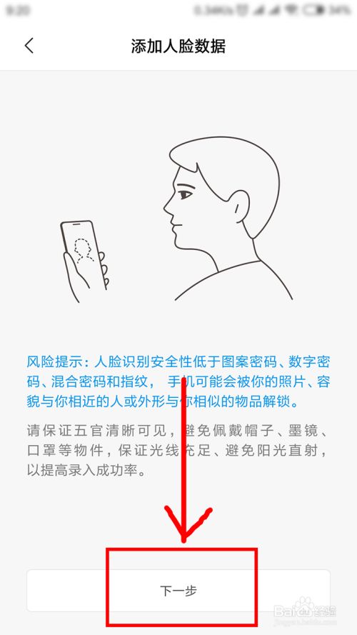 到这个界面是一些介绍和须知,点击【下一步】即可。(这个人脸解锁的安全性会比图案和数字解锁低)