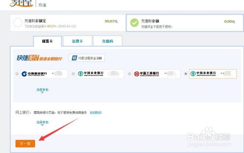 在打开的“支付宝充值”界面中,选择要使用的银行卡,点击“下一步”按钮。