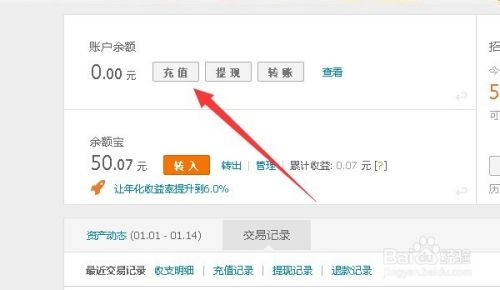 登陆支付宝成功后,在“我的支付宝”主界面点击“账号余额”右侧的“充值”按钮。如图所示: