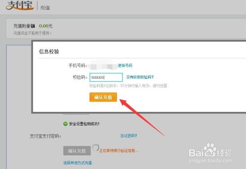 接下来输入要转入的金额,同时利用手机进行验证或输入支付密码,完成资金转入支付宝账号操作。