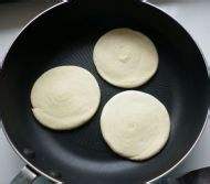 平底煎锅烧热,将饼胚放进去烙之。