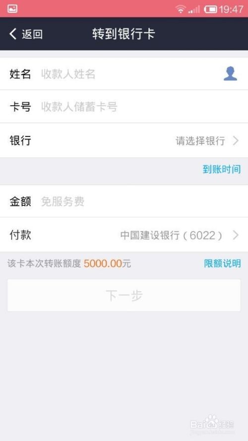 接着操作就是输入收款对方姓名、账号、金额完成后点击下一步,然后付款就可以了