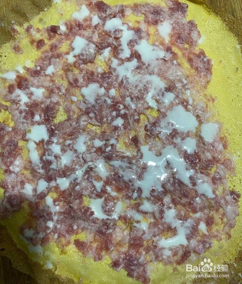 摊好的蛋皮放置备用,把五花肉剁碎摊到鸡蛋皮上