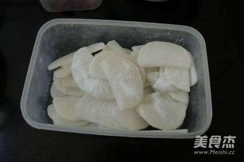 2萝卜切片后用盐腌20分钟,洗去盐份