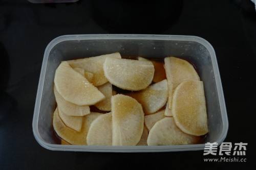 3把陈醋、糖、酱油放一起泡腌过的萝卜片至入味,约2小时(酸甜口味可根据个人喜好调节,也可用白醋)