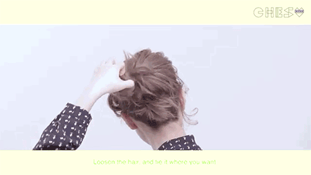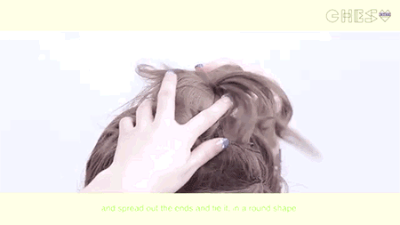 接着处理上面的辫子,将一半的头发收进去,笼成一个花苞状,再用手把头发抓得蓬松一些
