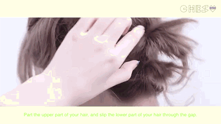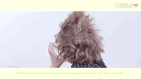 首先揪起一部分头发,扎成一个小辫,然后将底下的头发用卷发棒烫成微卷的效果。