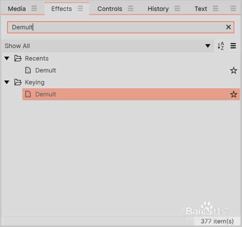 接下来我们在“Effects”窗口中搜索 “Demult”特效,在“黑色背景视频图层”中应用此特效;
