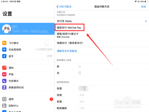 最后,我们在付款方式的页面中选择“微信支付”并完善自己的个人住址信息,再选择“完成”即可设置完成。