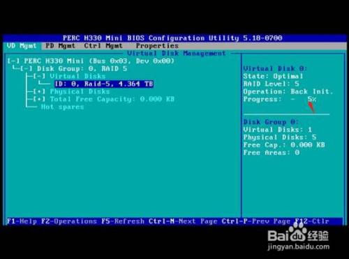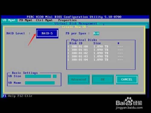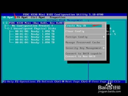 把选项移动到最上面:PERC H330 Mini,按F2键,选择:create New VD,创建一个raid组。如图所示: